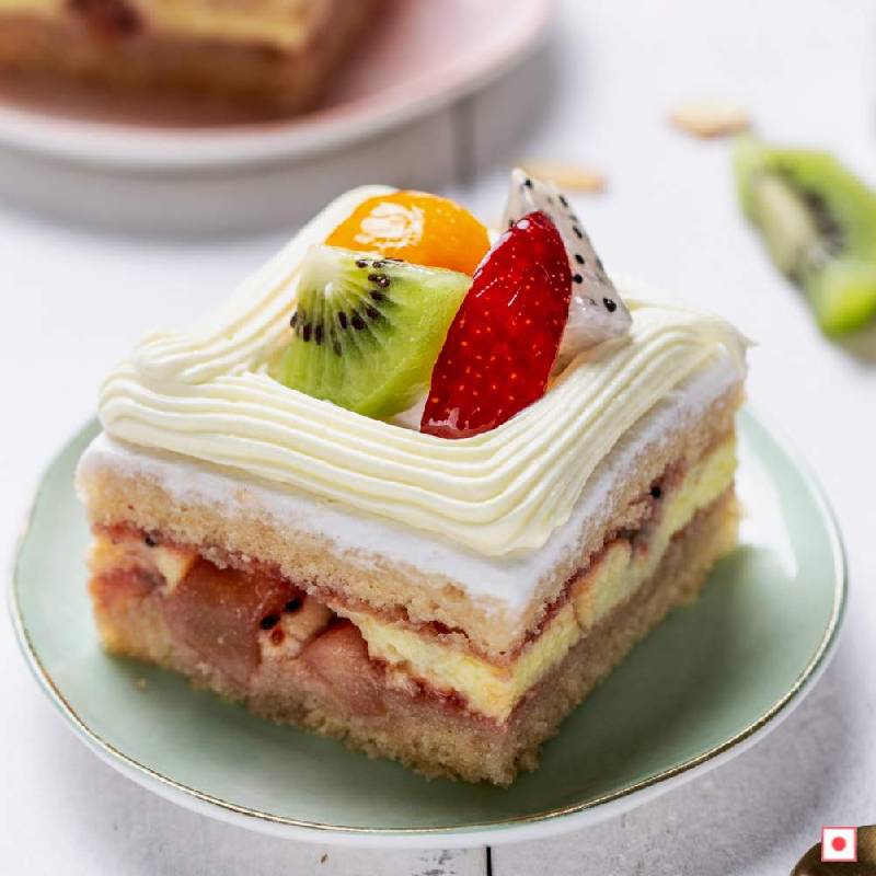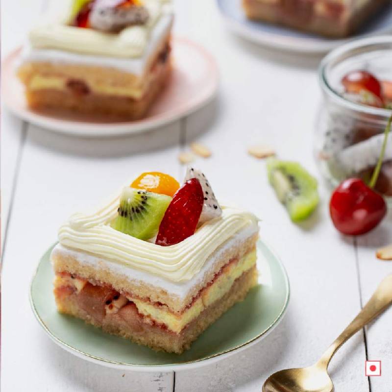 Bursting with fresh & fruity flavours, it is made with layers of vanilla sponge, fluffy whipped cream, juicy fresh fruits & fruit compote, topped with seasonal fresh fruits